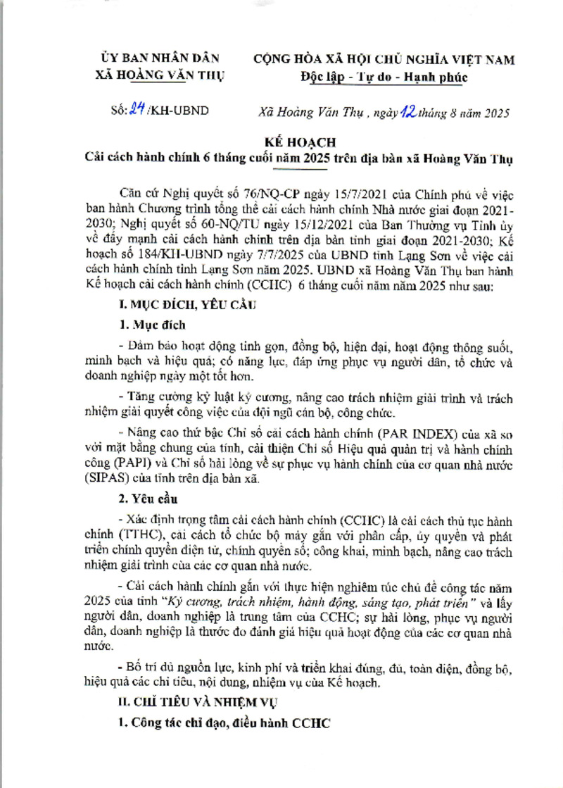Tiêu đề văn bản | KẾ HOẠCH Cải cách hành chính 6 tháng cuối năm 2025 trên địa bàn xã Hoàng Văn Thụ | ||