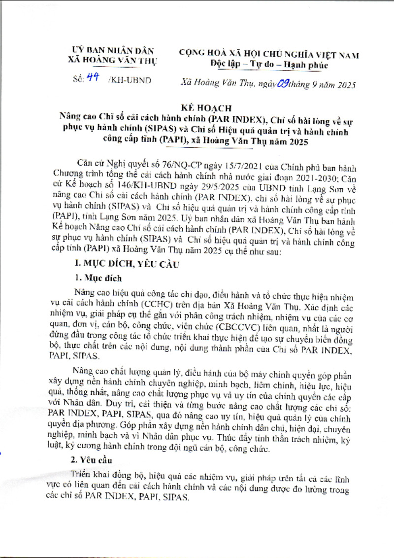 Tiêu đề văn bản | KẾ HOẠCH Nâng cao Chỉ số cải cách hành chính (PAR INDEX), Chỉ số hài lòng về sự phục vụ hành chính (SIPAS) và Chỉ số Hiệu quả quản trị và hành chính công cấp tỉnh (PAPI), xã Hoàng Văn Thụ năm 2025 | ||
