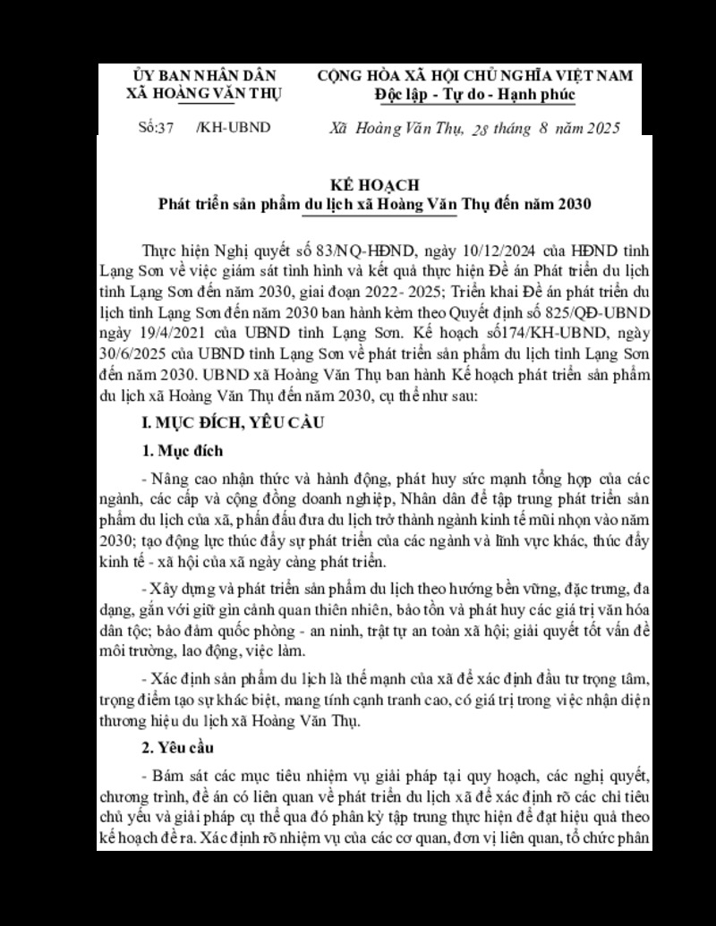 Tiêu đề văn bản | KẾ HOẠCH Phát triển sản phẩm du lịch xã Hoàng Văn Thụ đến năm 2030 | ||
