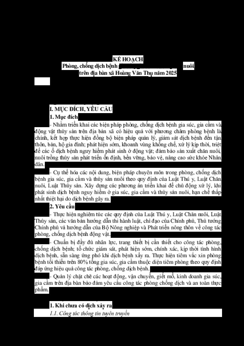 Tiêu đề văn bản | KẾ HOẠCH Phòng, chống dịch bệnh gia súc, gia cầm và thủy sản nuôi trên địa bàn xã Hoàng Văn Thụ năm 2025 | ||