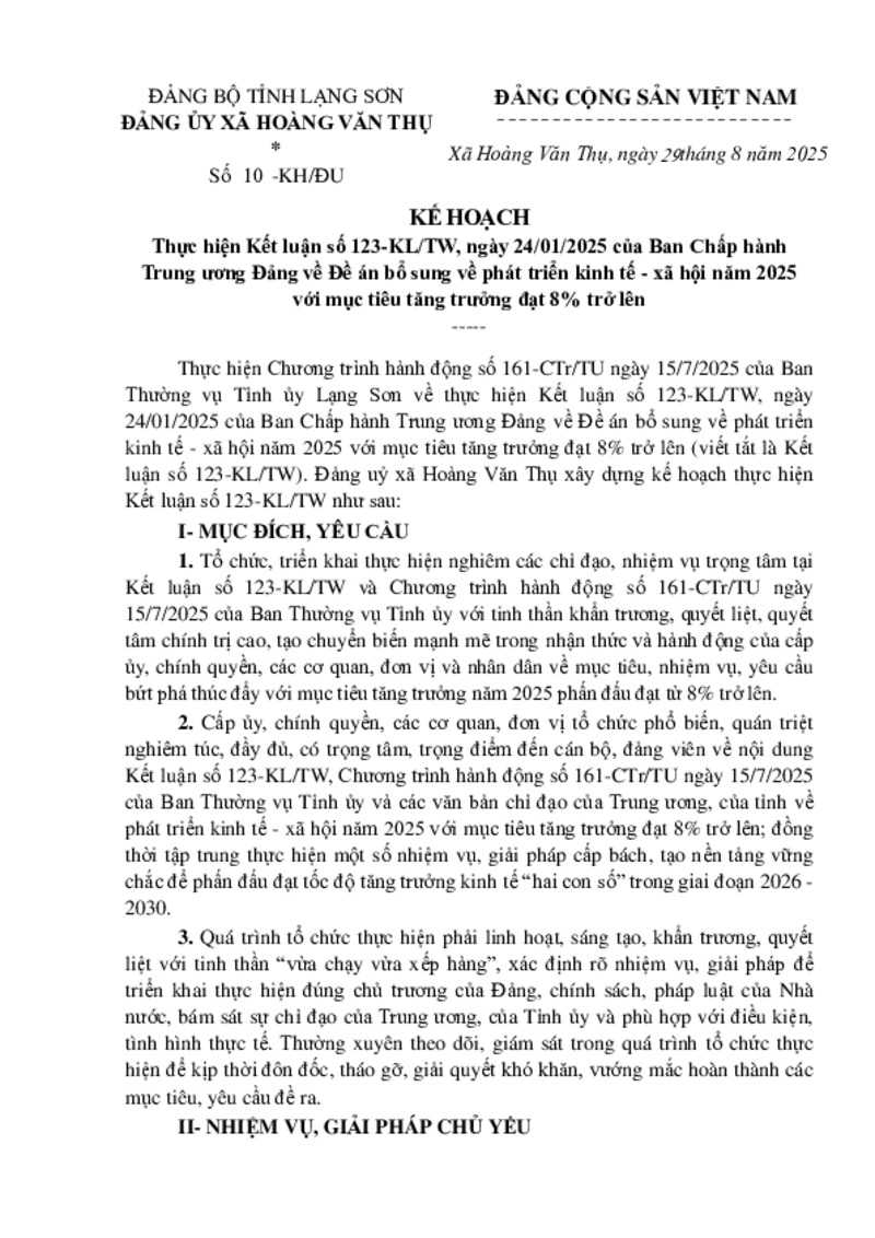 Tiêu đề văn bản | KẾ HOẠCH Thực hiện Kết luận số 123-KL/TW, ngày 24/01/2025 của Ban Chấp hành Trung ương Đảng về Đề án bổ sung về phát triển kinh tế - xã hội năm 2025 với mục tiêu tăng trưởng đạt 8% trở lên | ||