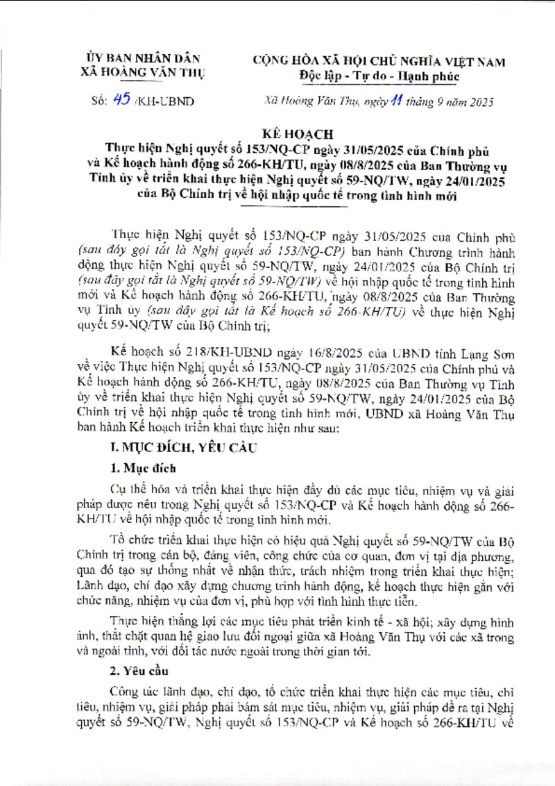 Tiêu đề văn bản | Kế hoạch Thực hiện Nghị quyết số 153/NQ-CP ngày 31/05/2025 của Chính phủ và Kế hoạch hành động số 266-KH/TU, ngày 08/8/2025. | ||