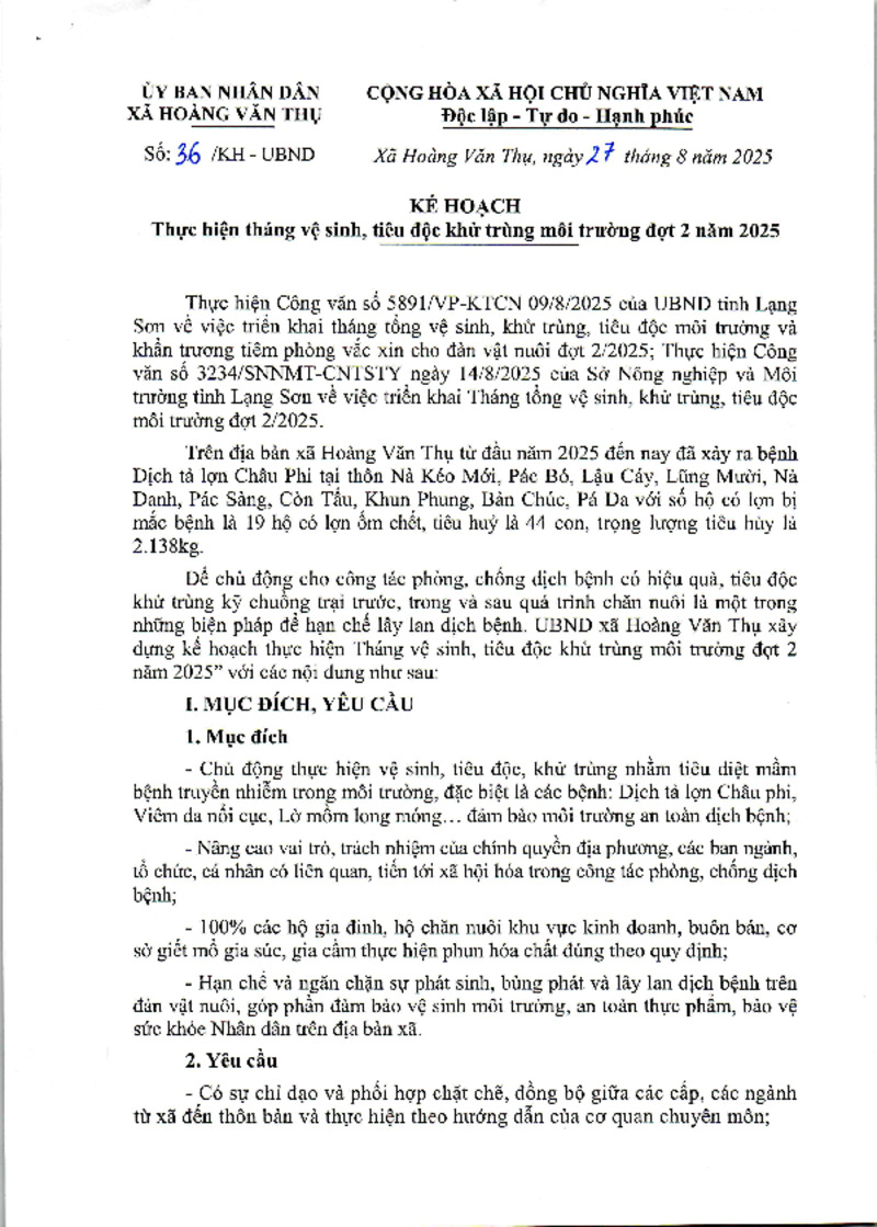 Tiêu đề văn bản | Kế hoạch Thực hiện tháng vệ sinh, tiêu độc khử trùng môi trường đợt 2 năm 2025 | ||