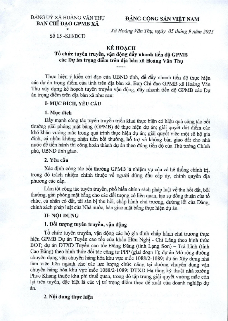 Tiêu đề văn bản | KẾ HOẠCH Tổ chức tuyên truyền, vận động đẩy nhanh tiến độ GPMB các Dự án trọng điểm trên địa bàn xã Hoàng Văn Thụ | ||