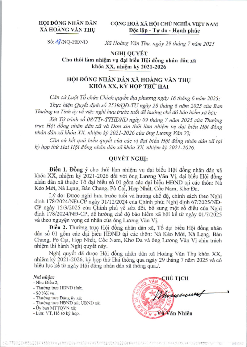 Tiêu đề văn bản | Nghị quyết cho thôi làm nhiệm vụ đại biểu Hội đồng nhân dân xã khóa XX, nhiệm kỳ 2021 - 2026 | ||