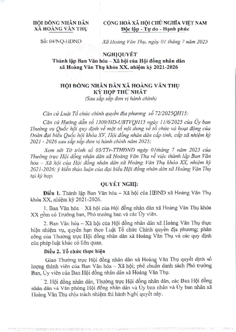 Tiêu đề văn bản | Nghị quyết Thành lập Ban Kinh tế - Ngân sách của Hội đồng nhân dân xã Hoàng Văn Thụ khóa XX, nhiệm kỳ 2021-2026 | ||