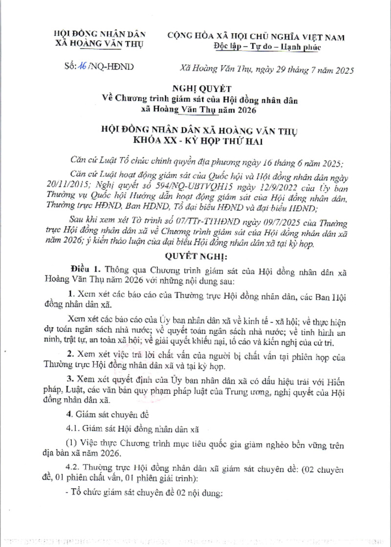 Tiêu đề văn bản | Nghị quyết về Chương trình giám sát của Hội đồng nhân dân xã Hoàng Văn Thụ năm 2026 | ||