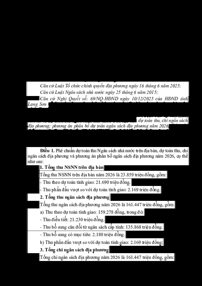| Tiêu đề văn bản | Nghị quyết Về dự toán thu ngân sách nhà nước trên địa bàn, dự toán thu, chi ngân sách địa phương và phương án phân bổ dự toán ngân sách địa phương năm 2026 | ||