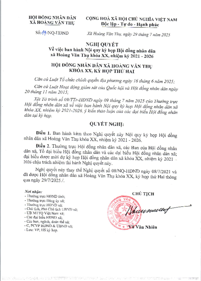 Tiêu đề văn bản | Nghị quyết về việc ban hành Nội quy kỳ họp Hội đồng nhân dân xã Hoàng Văn Thụ khóa XX, nhiệm kỳ 2021 - 2026 | ||
