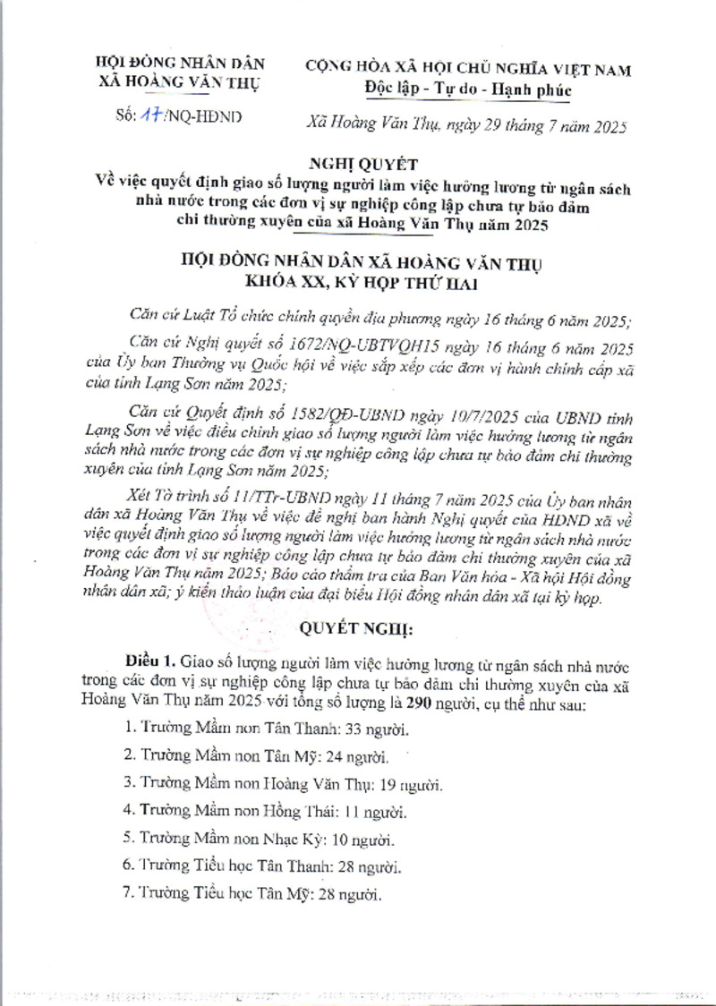 Tiêu đề văn bản | Nghị quyết về việc Qđ giao số lượng người làm việc hưởng lương từ NSNN trong các đơn vị Sự nghiệp công lập chưa tự đảm bảo chi thường xuyên của xã Hoàng Văn Thụ năm 2025 | ||