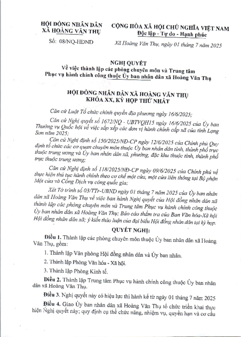 Tiêu đề văn bản | Nghị quyết Về việc thành lập các phòng chuyên môn và Trung tâm Phục vụ hành chính công thuộc Ủy ban nhân dân xã Hoàng Văn Thụ | ||