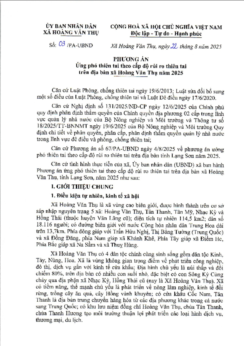 Tiêu đề văn bản | phương án Ứng phó thiên tai theo cấp độ rủi ro thiên tai trên địa bàn xã Hoàng Văn Thụ năm 2025 | ||