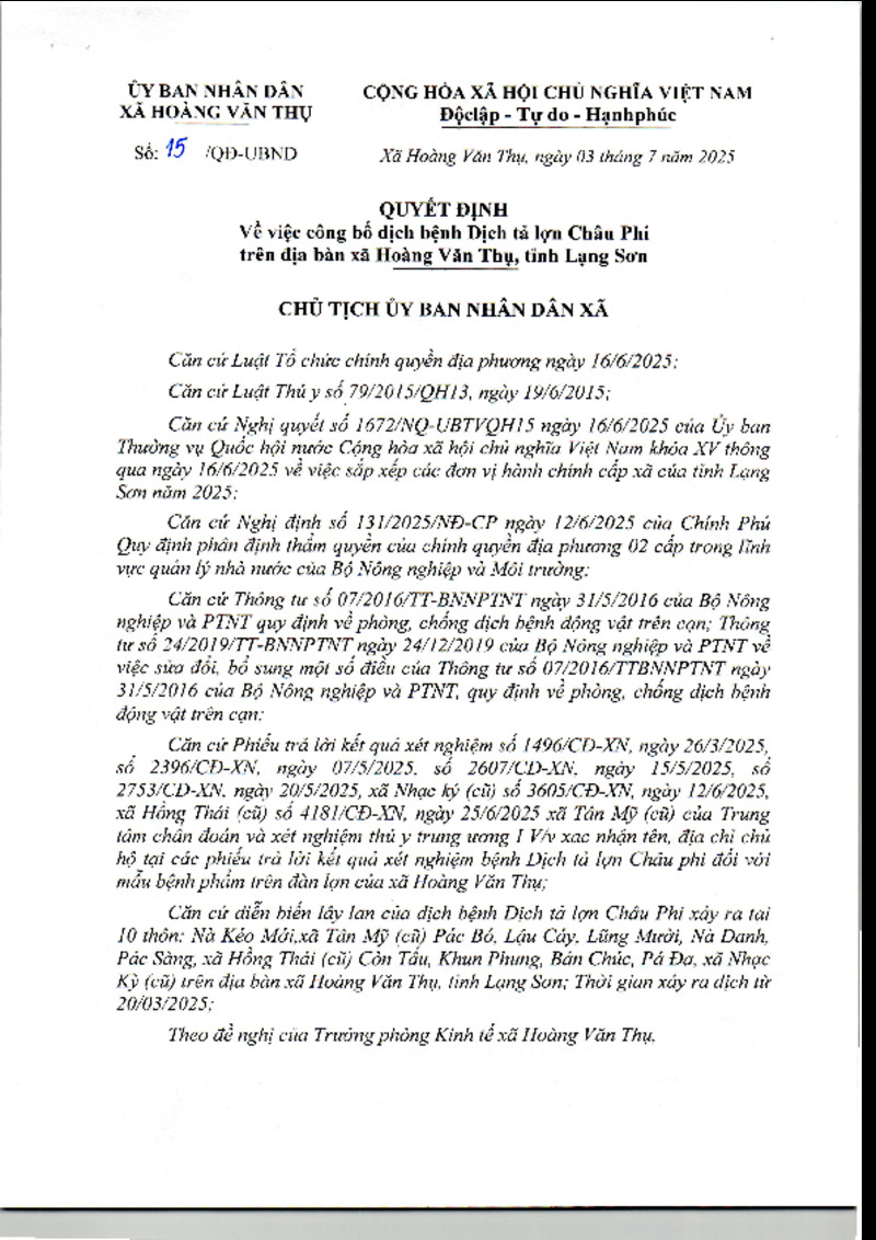 Tiêu đề văn bản | QUYẾT ĐỊNH Về việc công bố dịch bệnh Dịch tả lợn Châu Phi trên địa bàn xã Hoàng Văn Thụ, tỉnh Lạng Sơn | ||