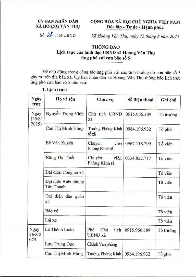 Tiêu đề văn bản | THÔNG BÁO Lịch trực của lãnh đạo UBND xã Hoàng Văn Thụ ứng phó với cơn bão số 5 | ||