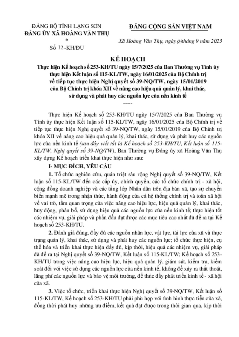 Tiêu đề văn bản | Thực hiện Kế hoạch số 253-KH/TU ngày 15/7/2025 của Ban Thường vụ Tỉnh ủy thực hiện Kết luận số 115-KL/TW, ngày 16/01/2025 của Bộ Chính trị về tiếp tục thực hiện Nghị quyết số 39-NQ/TW, ngày 15/01/2019 | ||
